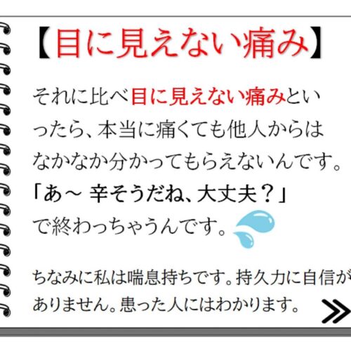 基本的に外見からは見えない痛みを少しでも和らげ退治していきたい!