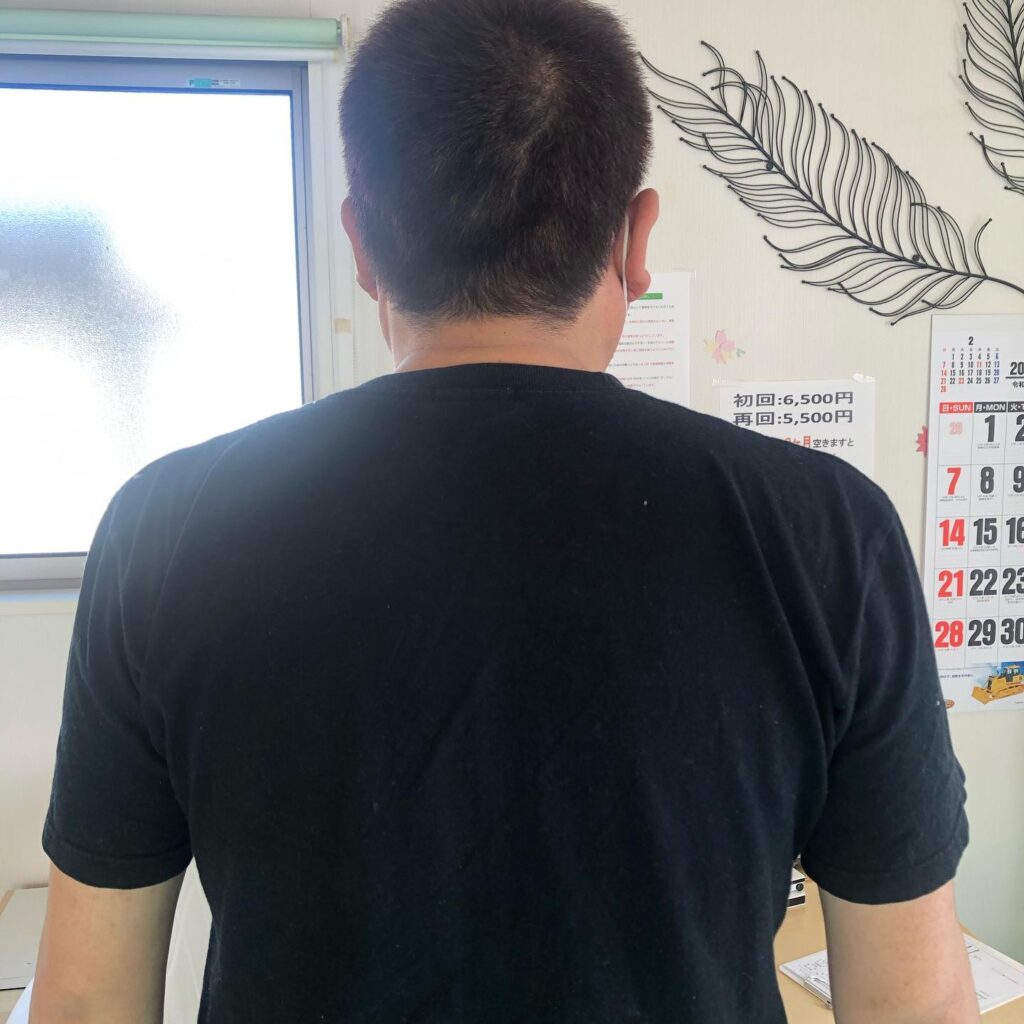 背中側を見ても肩甲骨がグイっと首の方に持ち上がってる状態でした。