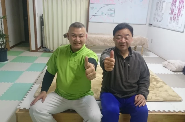 上山市からお越しのHさん。私の宅トレの先生でもあります。来院の度にトレーニングポイントを教えてもらえるので とても助かってまーす!Hさんは 腕の痛みと全身の調整で来院です。力